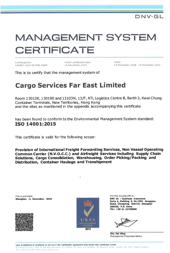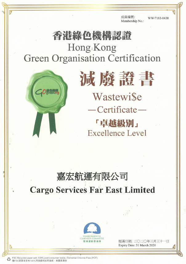 Cargo Services is ISO14001:2015 certified. We have been granted a “Class of Excellence on Wastewi$e Award” in Hong Kong Awards for Environmental Excellence since 2002 which is organised by Environmental Campaign Committee.